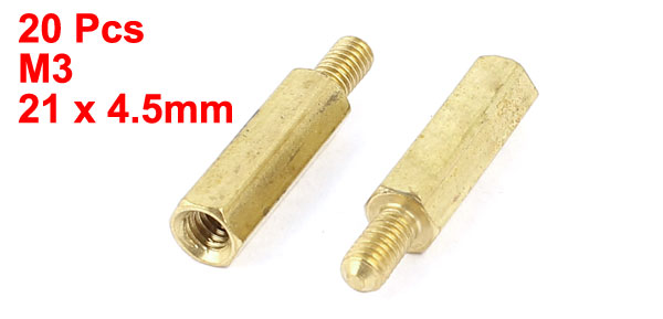 Product Name Standoff Hexagonal Spacer Thread Size M3 Male x M3 Female Male Thread Length 6mm/ 0.24" Body Length 15mm/ 0.6" Total Size(Approx.) 21 x 4.5mm/ 0.83" x 0.06" (L*Max.D) Material Brass Color Gold Tone Net Weight 40g Package Content 20 x Standoff Hexagonal Spacer