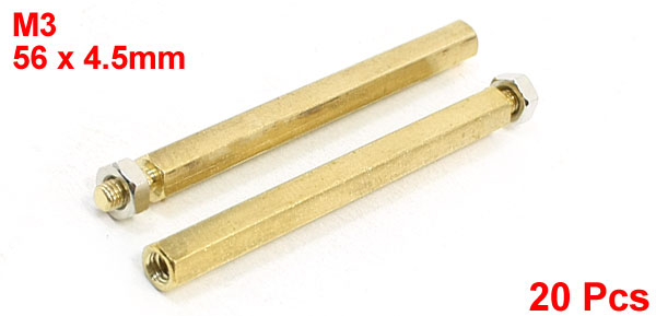 Product Name Standoff Hexagonal Spacer Thread Size M3 Male x M3 Female Male Thread Length 6mm/ 0.24" Body Length 50mm/2" Total Size(Approx.) 56 x 4.5mm/ 2.2" x 0.06" (L*Max.D) Material Brass Color Gold Tone Net Weight 140g Package Content 20 x Standoff Hexagonal Spacer
