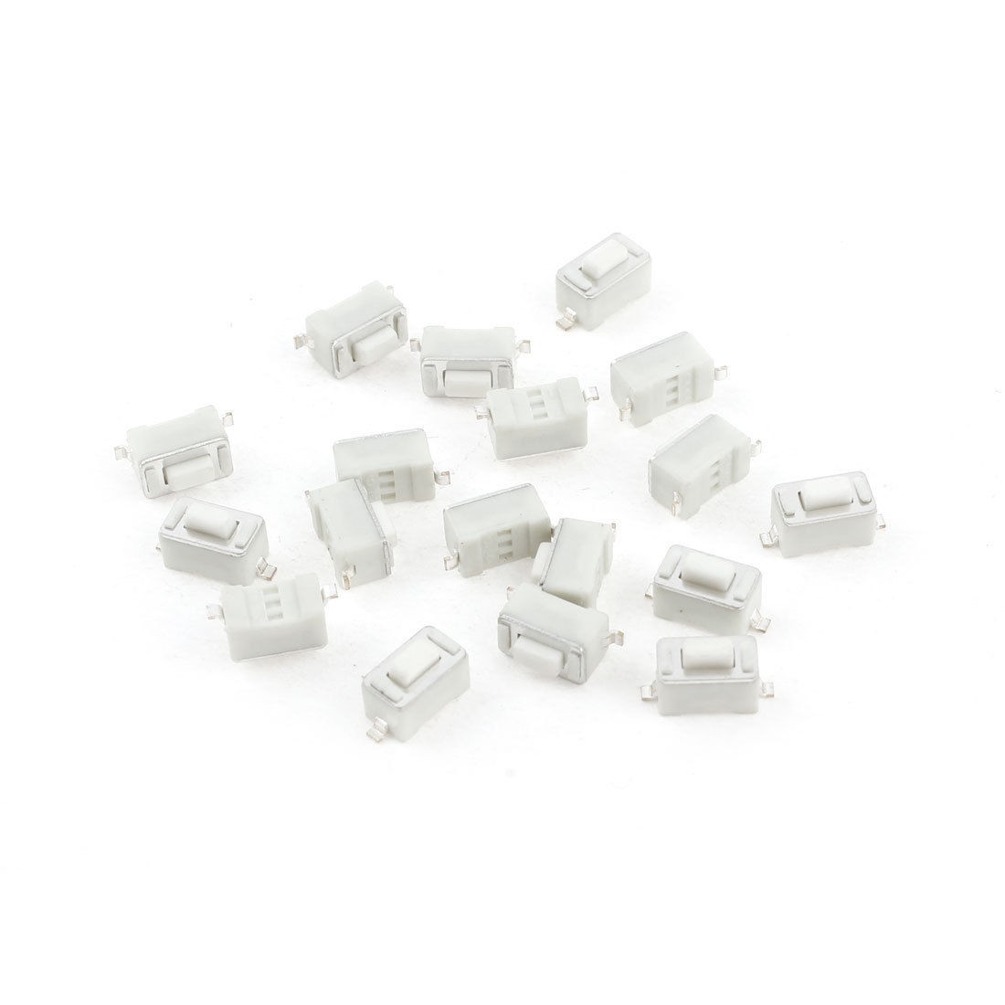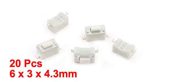 Details20pcs Momentary Rectangular Tact Push Button Switch SMT SMD SPST 6x3x4.3mm  Product Name Tact Switch Action Type Momentary Contact Type SPST Body Size(Pin Not Included) 6 x 3 x 4.3mm/0.24" x 0.12" x 0.17"(L*W*T) Button Size 3 x 1.5mm/ 0.12" x 0.06"(L*W) Current 50mA Voltage DC 12V Material Plastic, Metal Color As Picture Shown Weight 3g Package Content 20 x Tact Switches