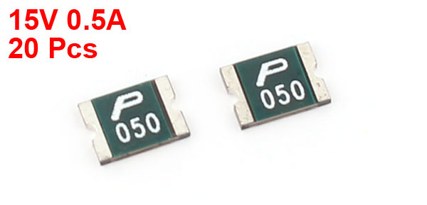 Product Name SMD Resettable Fuse Type P050 Features Fast Blow(F) Low Breaking Capacity(L) Package Type SMD1812 Size 5 x 3 x 0.6mm/0.2" x 0.12" x 0.024"(L*W*T) Max. Voltage 15V Max. Current 0.5A External Material Epoxy, Glass Substrate Color Dark Green, Silver Tone Net Weight 2g Package Content 20 Pcs x SMD Resettable Fuses - Reviews