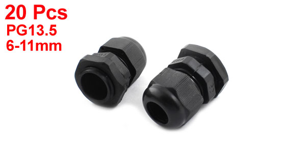 Product Name Cable Gland Model PG13.5 Cable Range 6-11mm / 0.24" x 0.43" Thread O.D. 20mm / 0.8" Mounting Thread Length 10mm / 0.4" Total Size 30 x 35mm / 1.2" x 1.4" (Max.D*H) Material Plastic Color Black Weight 204g Package Content 20 x Cable Gland - Reviews