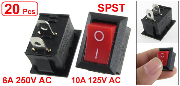 Product Name Rocker Switch Poles SPST Terminals 2 Pin (On - Off) Voltage 10A 125V AC 6A 250V AC Total Size(Each One) 2 x 1.5 x 2.5cm/0.9'' x 0.6'' x 1'' (L*W*T) Mounting Dimension 1.8 x 1.2 x 1.9cm/0.7'' x 0.5'' x 0.7'' (L*W*Depth) Color Black, Red Material Plastic & Metal Total Weight 65g Package Content 20 x Rocker Switch - Reviews