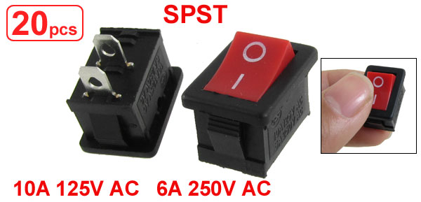 Product Name Rocker Switch Poles SPST Terminals 2 Pin (On - Off) Voltage 10A 125V AC 6A 250V AC Total Size(Each One) 2 x 1.5 x 2.5cm/0.9'' x 0.6'' x 1'' (L*W*T) Mounting Dimension 1.8 x 1.2 x 1.9cm/0.7'' x 0.5'' x 0.7'' (L*W*Depth) Color Black, Red Material Plastic & Metal Total Weight 61g Package Content 20 x Rocker Switch - Reviews