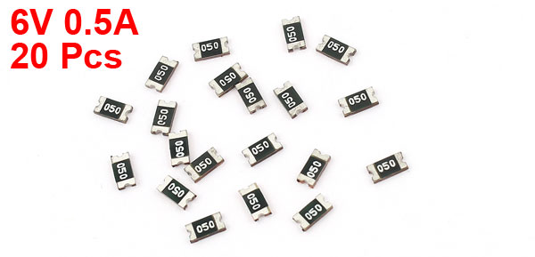 Product Name SMD Resettable Fuse Type P050 Package Type SMD1206 Size 3 x 2 x 0.5mm/0.12" x 0.08" x 0.02"(L*W*T) Max. Voltage 6V Max. Current 0.5A External Material Epoxy, Glass Substrate Color Black, Silver Tone Net Weight 2g Package Content 20 x SMD Resettable Fuses - Reviews