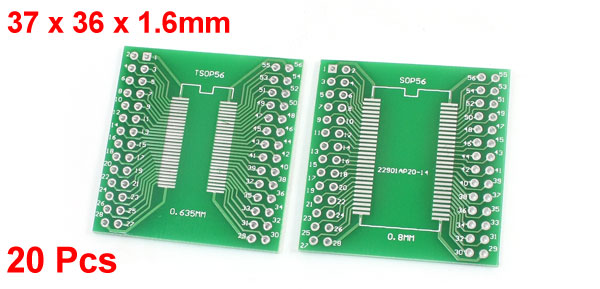 Product Name SOP56 SSOP56 TSSOP56 Adapter Plate Pin Pitch 0.635mm/0.8mm,2.54mm/0.1" Body Size 37 x 36 x 1.6mm/1.5" x 1.5" x 0.06"(L*W*T) Material FR-4, Electronic Part Main Color Green Net Weight 75g Package Content 20Pcs x SOP56 SSOP56 TSSOP56 Adapter Plate - Reviews