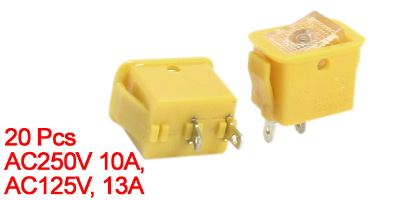 Product Name Rocker Switch Model MJ-11 Poles SPST Action Type Latching Terminals 2 Pin (On-Off) Rating Voltage AC250V 10A, AC125V, 13A Total Size(Each One) 19 x 12 x 21mm/ 0.75" x 0.47" x 0.83"(L*W*T) Mounting Size 18 x 11mm/ 0.71" x 0.43"(L*W) Body Color Yellow Button Color Clear Material Plastic, Metal Weight 44g Package Content 20 x Rocker Switches  - Reviews
