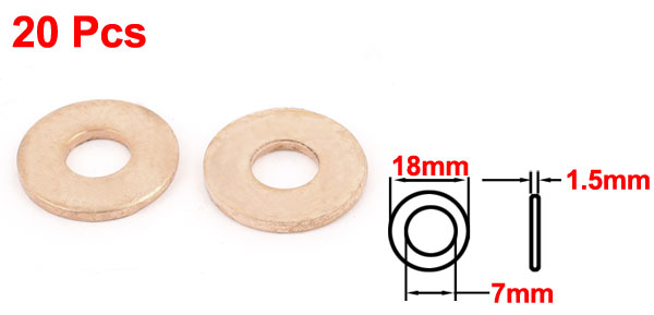 Product Name Copper Washer Inner Diameter 7mm/0.28" Outer Diameter 18mm/0.71" Thickness 1.5mm/0.06" Material Copper Color Copper Tone Weight 53g Package Content 20 Pcs x Copper Washer - Reviews