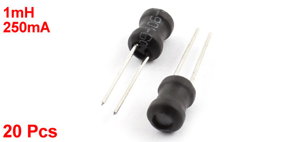 Product Name Radial Lead Inductor Inductance 1mH Rating Current 250mA Tolerance 10% Body Size 5 x 7mm / 0.2" x 0.27"(D*H) Pin Length 15mm/ 0.6" Lead Distance 2.5mm / 0.1" Color Black, Silver Tone Weight 14g Package Content 20 x Radial Lead Inductor - Reviews