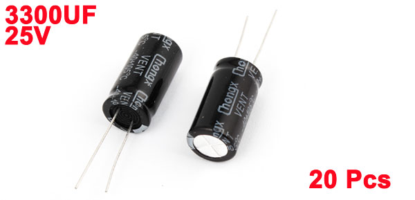 Product Name Electrolytic Capacitor Type Radial Maximum Temperature 105°C Voltage 25V Capacitance 3300uF Size 13 x 25mm/0.5" x 1"(D*H) Lead Space 4.5mm Lead Length 2.7mm/0.1", 2.3mm/0.09" External Material Aluminum Total Net Weight 93g Main Color Black, Silver Tone Package Content 20PCS x Electrolytic Capacitors - Reviews