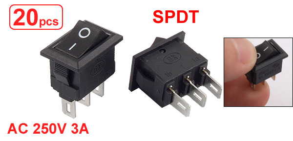 Product Name Rocker Switch Poles SPDT Terminals 3 Pins Position On/On Two Position Rated Voltage AC 250V 3A Overall Size 1.5 x 1 x 2cm / 0.59" x 0.39" x 0.79" (L*W*H) Mounting Size 1.3 x 0.8 x 1.5cm / 0.51" x 0.31" x 0.59" (L*W*H) Color Black, Silver Tone Material Plastic, Metal Total Weight 29g Package Content 20 x Rocker Switches - Reviews