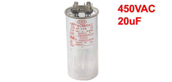 Product Name Motor Capacitor Material Polypropylene Film Model CBB65A-1 Capacitance 20uF Tolerance ±5% Rated Voltage AC 450V Frequency 50/60Hz Body Size 47 x 99mm/ 1.9" x 3.9" (D*H) Main Color Silver Tone Weight 167g Package Content 1 x Motor Capacitor - Reviews