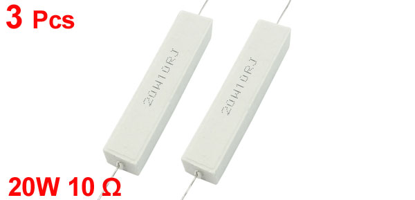Details20W 10 Ohm 5% Axial Ceramic Cement Power Resistor 3 Pcs  Product Name Cement Resistor Body Material Cement Power 20W Resistance 10Ω Tolerance ±5% (J) Body Size (Approx.) 60 x 12 x 10mm/2.3" x 0.47" x 0.4" (L * W * H) Lead Diameter(Approx.) 0.8mm/0.031" Color White Weight 57g Package Content 3 x Cement Resistors