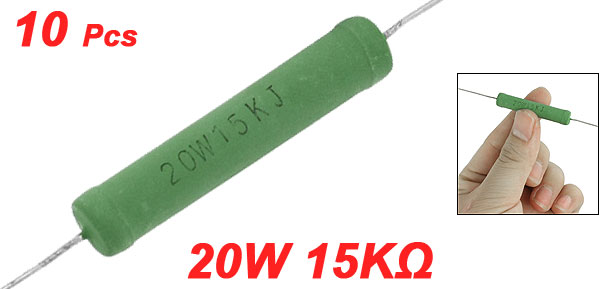 Product Name Wire Wound Resistor Type Fixed Type Rated Power 20W Resistance 15K Ω Resistance Tolerance ±5% (J) Material Metal, Ceramic Pin Diameter 0.7mm/ 0.028" Pin Length 29mm/ 1.1" (Each End) Body Size 7 x 40mm/ 0.28" x 1.6" (D*L) Total Length 100mm/ 3.9" Color Green Weight 48g Package Content 10 x Wire Wound Resistors - Reviews