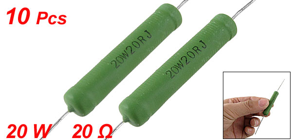 Product Name Wire Wound Resistor Type Fixed Type Rated Power 20W Resistance 20 Ω Resistance Tolerance ±5% (J) Material Metal, Ceramic Pin Diameter 0.7mm/ 0.028" Pin Length 29mm/ 1.1" (Each End) Body Size 7 x 40mm/ 0.28" x 1.6" (D*L) Total Length 100mm/ 3.9" Color Green Weight 57g Package Content 10 x Wire Wound Resistors - Reviews
