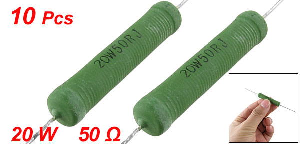 Product Name Wire Wound Resistor Type Fixed Type Rated Power 20W Resistance 50 Ω Resistance Tolerance ±5% (J) Material Metal, Ceramic Pin Diameter 0.7mm/ 0.028" Pin Length 29mm/ 1.1" (Each End) Body Size 7 x 40mm/ 0.28" x 1.6" (D*L) Total Length 100mm/ 3.9" Color Green Weight 49g Package Content 10 x Wire Wound Resistors - Reviews