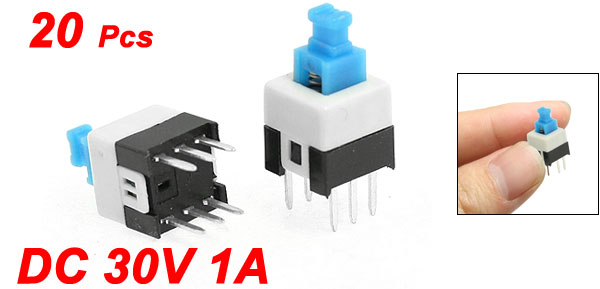 Product Name Push Button Switch Use for Flashlight, Torch, Electric Toys Action Type Momentary Contact Type 1 NO 1 NC Rated Load DC 30V 1A Size 7 x 7 x 16mm/ 0.27" x 0.27" x 0.63" (L*W*T) Pin Number 6 Pin Pitch 1.5mm/ 0.06" Material Plastic, Metal Color Gray, Black ,Blue Net Weight 10g Package Content 20 x Push Button Switch - Reviews