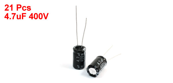 Product Name Electrolytic Capacitor Type Radial Lead Temperature Range -40°C to 105°C Withstand Voltage 400V Capacitance 4.7uF Body Size 8 x 13 mm / 0.3'' x 0.5'' (D*L) Lead Length 21mm / 0.8'', 25 mm / 1'' Lead Spacing 3 mm / 0.1" External Material Aluminum Weight 23g Color Black Package Content 21 Pcs x Electrolytic Capacitors - Reviews