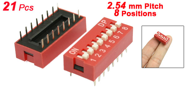 Product Name DIP Switch Type 8 Position Slide Type Poles 2 x 8 Pins(2 rows) Pitch 2.54mm Non-Switching Rating 100mA DC 50V Switching Rating 25mA DC 24V Dimension 2 x 1 x 1cm/ 0.8" x 0.4" x 0.4"(L*W*H) Material Plastic, Electric Parts Main Color Red Weight 44g Package Content 21 Pcs x DIP Switches - Reviews