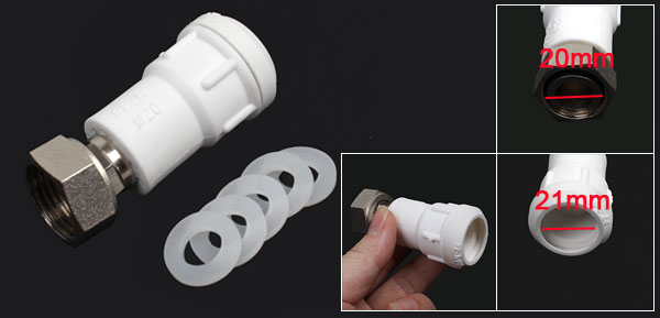 Product Name Quick Coupler Female Thread Diameter 20mm Thread Size 1/2" PT Fit Tube Outside Dia. 21mm / 0.8" Overall Size 68 x 28mm / 2.7" x 1.1"(L*Max.D) Color Brass Tone , White Material PPR, Metal Weight 42g Package Content 1 x Quick Coupler