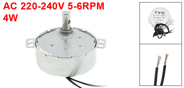 Power 4W Frequency 50/ 60Hz Overall Size 4.8 x 2cm/ 1.9" x 0.78" (D*T) Shaft Size 7 x 15mm/ 0.27" x 0.59" (D*L) Mount Hole Dia. 4.5mm/ 0.18" Cable Length 41cm/ 16.1" Main Material Metal, Plastic Color Silver Tone, Black Net Weight 80g Package Content 1 x Synchronous Motor - Reviews