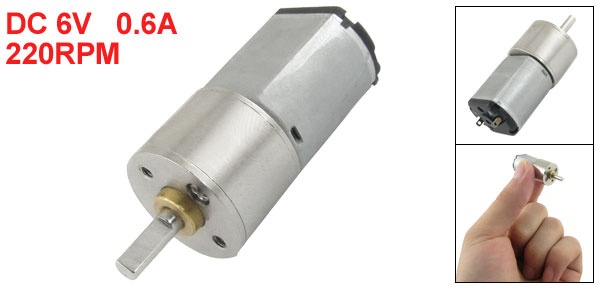 Product Name DC Geared Motor Rated Voltage DC 6V Rated Current 0.6A ( no load ) Speed 220 RPM Shaft Diameter 3mm/ 0.118" Gearbox Size 16 x 17mm/ 0.63" x 0.66" (D*H) Overall Size 16 x 48mm/ 0.63" x 1.88" (D*H) Main Color Silver Tone Material Metal Weight 21g Package 1 x DC Geared Motor - Reviews