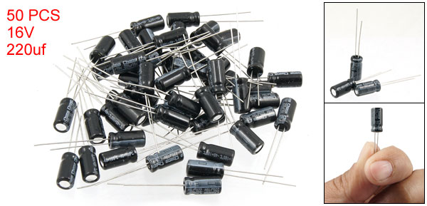Item Name Electrolytic Capacitor Maximum Temperature -40~105°C Voltage-Rated 16V Capacitance 220uF Size 12.5 x 6mm Pin Length 26mm and 21mm Material Aluminum Weight 29g Package Content 50 Pieces Electrolytic Capacitors - Reviews