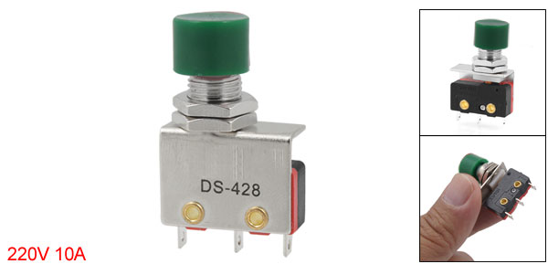 Product Name Limit Switch Model DS428 Type Push Button, SPDT Color Green, Silver Tone Rating 220V 10A Button Diameter 10mm/ 0.4" Plug Distance 5.5mm, 17.5mm Total Size 35 x 20 x 9mm / 1.4" x 0.8" x 0.35" (L*W*H) Weight 10g Package Content