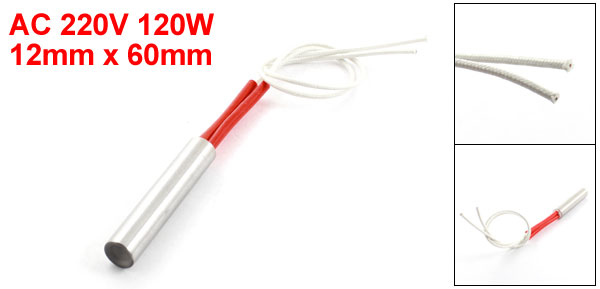 Product Name Cartridge Heater Material Stainless Steel, PVC, Nylon Rated Voltage AC 220V Power 120W Heater Size (Approx.) 12 x 60mm / 0.47" x 2.4" (D * L ) Wire Length(Approx.) 26cm / 10" Color Silver Tone, Red Net Weight 36g Package Content 1 x Cartridge Heater - Reviews