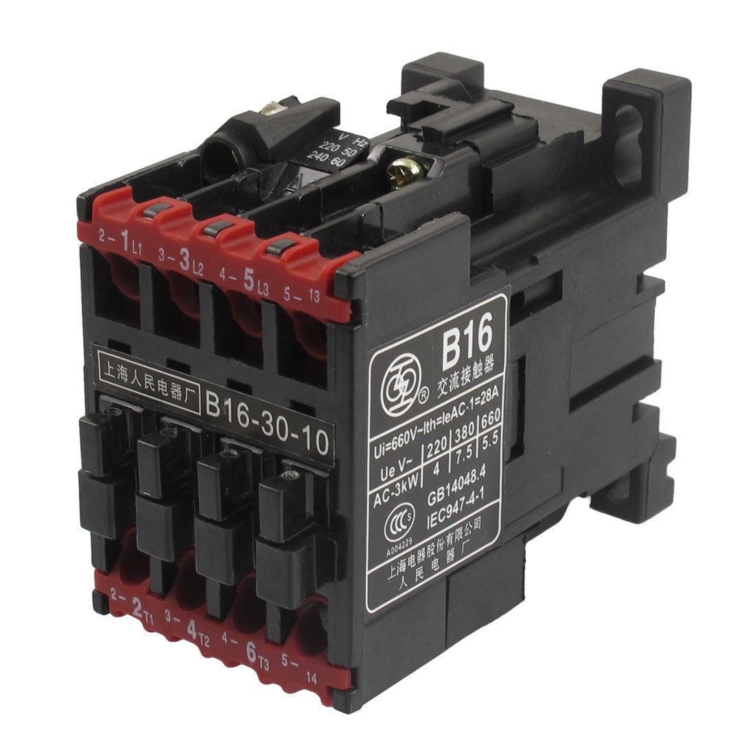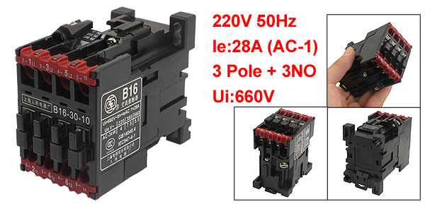 Product Name AC Contactor Model Number B16-30-10 Material Plastic, Metal, Electrical Parts Coil Voltage 220V 50Hz Ui 660V Ue 660V Ith 28A Ie 28A (AC-1) Power 5.5KW(AC-3) Number of Contact 3 Pole + 3NO Terminals Number 4 Screw Terminals Overall Size (Approx.) 8.2 x 7.1 x 4.4cm/3.23" x 2.8" x 1.73 (L*W*T) Mounting Size 35mm Mounting Rail Color Black Net Weight 308g Package Content 1 x AC Contactor - Reviews