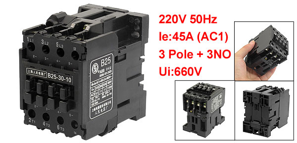 Product Name AC Contactor Model Number B25-30-10 Material Plastic, Metal, Electrical Parts Coil Voltage 220V 50Hz Ui 660V Ue 660V Ith 45A Ie 45A (AC-1) Power 11KW(AC-3) Number of Contact 3 Pole + 3NO Terminals Number 4 Screw Terminals Altitude <2000m Temperature -5C~40C Relative Humidity 50%(40C) Overall Size (Approx.) 8.7 x 7.9 x 5.4cm/3.43" x 3.11" x 2.13"(L*W*T) Mounting Size 35mm Mounting Rail Color Black Net Weight 435g Package Content 1 x AC Contactor - Reviews