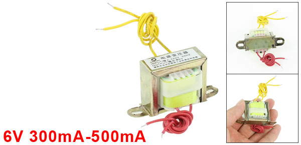 Product Name EI Power Transformer Material Metal, Magnet, Electric Parts Structure Style Single Phase Input 220V, 50Hz Output 6V 300mA-500mA Hole Center Spacing 47 mm / 1.85" Main Body Size 35 x 28 x 31 mm / 1.4" x 1.1" x 1.2" (L*W*H) Cable Length 17 cm / 6.7" Net Weight 105g Package Content 1 x EI Power Transformer - Reviews