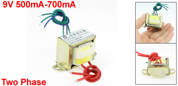 Product Name EI Power Transformer Material Metal, Magnet, Electric Parts Structure Style Two Phase Input 220V, 50Hz Output 9V 500mA-700mA Hole Center Spacing 56 mm / 2.2" Main Body Size 41 x 40 x 34 mm / 1.6" x 1.57" x 1.3" (L*W*H) Cable Length 16 cm / 6.3" Net Weight 200g Package Content 1 x EI Power Transformer - Reviews