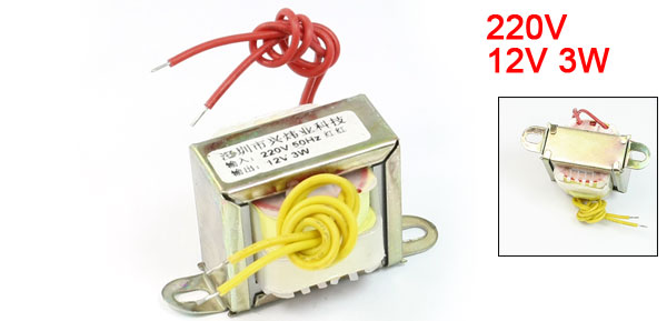Details220V 50Hz Input to 12V 3W Output EI Core Single Phase Power Transformer  Product Name EI Power Transformer Input 220V, 50Hz Output 12V 3W Structure Style Double Phase Material Metal, Magnet, Electric Parts Mounting Hole Center Spacing 60mm / 2.3" Main Body Size 35 x 30 x 15 mm / 1.3" x 1.1" x 0.6" (L*W*H) Cable Length 15 cm / 5.9" Net Weight 119g Package Content 1 x EI Power Transformer