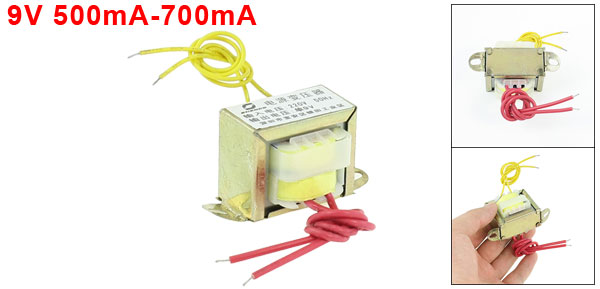 Product Name EI Power Transformer Material Metal, Magnet, Electric Parts Structure Style Single Phase Input 220V, 50Hz Output 9V 500mA-700mA Hole Center Spacing 55 mm / 2.2" Main Body Size 41 x 38 x 35 mm / 1.6" x 1.5" x 1.4" (L*W*H) Cable Length 15 cm / 5.9" Net Weight 200g Package Content 1 x EI Power Transformer - Reviews