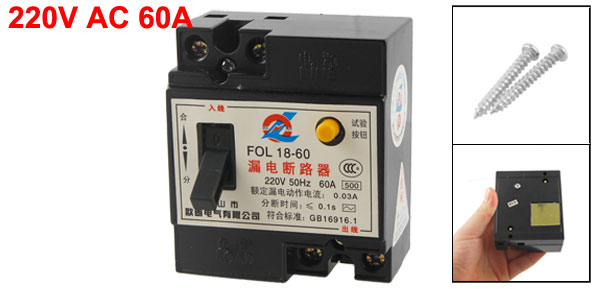 Product Name Residual Current Circuit Breaker Model No. FOL 18-60 Rated Voltage 220V AC, 50Hz Rated Circuit Breaking Capacity 0.03A Rated Current 60A Poles 2P Rated Residual Operating Current(I ^n) 30mA Residual Current Off-time ≤ 0.1s Mounting Hole Diameter 4.2mm / 0.16" Total Size (Approx.) 78 x 68 x 42mm / 3" x 2.67" x 1.65"(L*W*H) Color Black, Yellow Material Plastic, Electronic Parts Net Weight 172g Package Content 1 x Residual Current Circuit Breaker