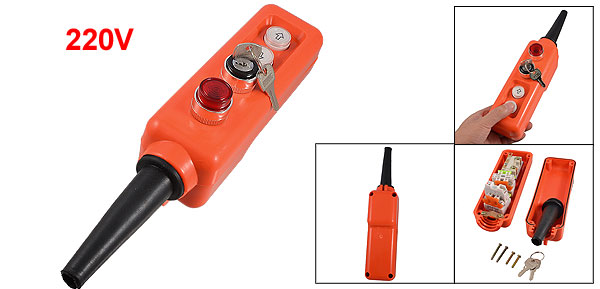 Product Name Hoist Pushbutton Switch Model No. COB COJ2073 Push Buttons Momentary Red Lamp, Up and Down Button Selector Handle Mode 2 Position(ON-OFF) UI 660V ITH 10A Lamp Voltage 220V Main Body Size 30 x 6 x 8.5cm / 11.8" x 2.4" x 2.4"(L*W*H) Insulating Tube Length 9.8cm / 3.9" Fit Cable Diameter 1.2cm / 0.5" External Material Plastic, Rubber Color Orangere, Black, Red, White