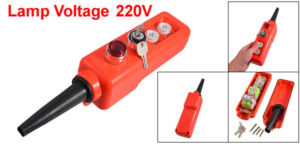 Product Name Hoist Pushbutton Switch Model No. COB COJ2079 Push Buttons Latching Red Lamp, Momentary Up and Down Button Selector Handle Mode 3 Position(ON-OFF-ON) Lamp Color Red UI 660V ITH 10A Lamp Voltage 220V Main Body Size 30 x 6 x 8.5cm / 11.8" x 2.4" x 2.4"(L*W*H) Insulating Tube Length 9.8cm / 3.9" Fit Cable Diameter 1.2cm / 0.5" External Material Plastic, Rubber Color Orangere, Black, Red,White