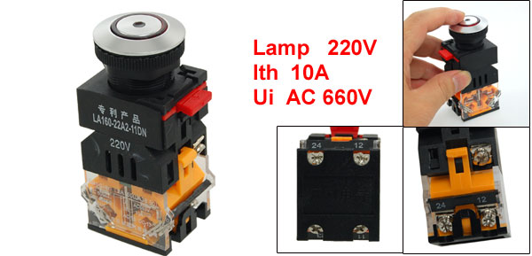Product Name Push Button Switch Model No. LA160-22A2-11DN Contact Type 1 NO(Normally Open) + 1 NC(Normally Close) Action Type Momentary Ith 10A Ui AC 660V Lamp Voltage 220V Panel Cutout Diameter 2.2cm / 0.87"(7/8") Fit Panel Thickness(Adjustable) Max 0.8cm / 0.3" Button Diameter 1.8cm / 0.7" Total Size 3.6 x 2.9 x 7.6cm / 1.4'' x 1.1'' x 3'' (L*W*H) Main Material Plastic, Metal Main Color Push Button: Red, Silver Tone Body: Black, Orange, Red Weight 64g Package Content 1 x Push Button Switch - Reviews