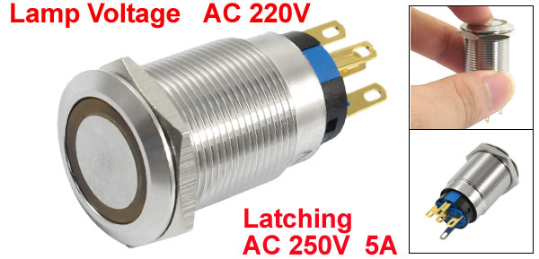 Item Name Stainless Steel Push Button Switch Operation Type Latching Contact 1NO 1NC Head Design Flat Round Lamp Voltage AC 220V Switch Rating AC 250V 5A Operation Pressure 2.5-4N Lamp Color Yellow Pin Number 5 Thread Diameter 17mm/0.6'' Total Size 40 x 25mm/1.5'' x 0.9''(L*Max.W) Material Stainless Steel, Electric Parts Housing Color Silver Tone Net Weight 22g Package Content 1 x Stainless Steel Push Button Switch - Reviews
