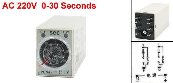 Product Name Timer Delay Relay Model Number H3Y-2 Pin Number 8 Pin Rating AC 220V Contact Type 5A 250VAC Resistive Load Contact Type DPDT Time Range 0-30 Seconds Indicator Operation Two Indicator Lamps Overall Size(Approx) 6.3 x 2.8 x 2.1cm/2.5" x 1.1" x 0.8"(L*W*H) External Material Plastic & Metal Net Weight 40g Package Content 1 x Timer Delay Relay