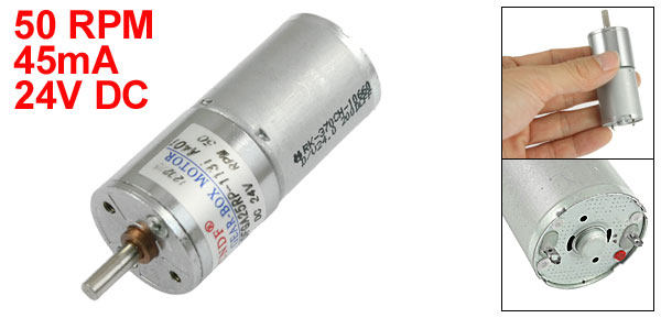 Product Name Gear Motor Rated Voltage DC 24V Rated Current 45mA Rated Torque 2.21Kg.cm Rated Speed 50 RPM Shaft Size 12 x 4mm/0.47" x 0.16" (L*D) Motor Body Length 55mm/2.2" Motor Body Diameter 25mm/1" Thread Diameter 2.5mm/0.1" Total Length(Included Pin) 71mm/2.8‘ Material Metal, Electronic Parts Color Silver Tone Weight 92g Package Content 1 x Gear Motor - Reviews