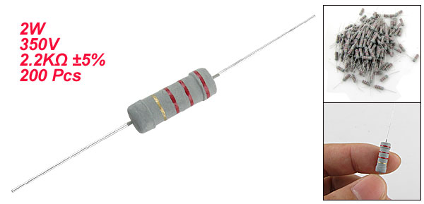 Details2.2K ohm 2K2 2W 5% Carbon Film Resistors 200 Pcs  Product Name Carbon Film Resistors Material Type Carbon Film Rated Power 2W Resistance Value 2.2K ohm Tolerance ±5% Withstand Voltage 350V Total Size 60 x 5mm / 2.36" x 0.196" (L * D) Lead Diameter 0.4mm / 0.0157" Color As Picture Shown Weight 178g Package Content 200 Pcs (± 2%) x Carbon Film Resistors