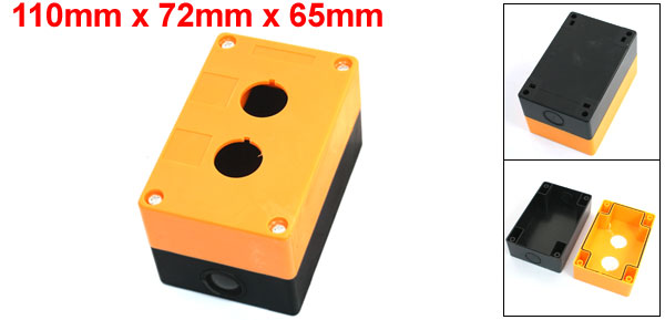 Product Name Push Button Switch Box Color Orange, Black Hole Diameter 22mm/ 0.87" Overall Size 110 x 72 x 65mm/ 4.3" x 2.8" x 2.6" (L*W*T) External Material Plastic Mounting Hole Dia. 5mm/ 0.2" Weight 141g Package Content 1 x Push Button Switch Box