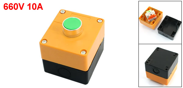 Product Name Push Button Switch w Control Box Action Type Momentary Hole Diameter 22mm/ 0.87" Ui 660V Ith 10A Contact Type SPDT Box Size 78 x 71 x 64mm/ 3.1" x 2.8" x 2.5" (L*W*T) Switch Size 37 x 30 x 63mm/ 1.5" x 1.2" x 2.5"(L*W*H) Mounting Hole Diameter 5.5mm/ 0.22" Total Height 78mm/ 3.1" External Material Plastic Button Color Green External Color Black, Orange Weight 146g Package Content 1 x Push Button Switch w Control Box