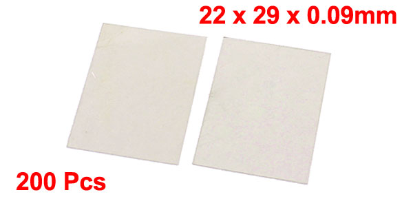 Product Name Mica Insulator Material Mica, Paper, Silicone Resin Size 22 x 29 x 0.09mm/ 0.87" x 1.14" x 0.0035(L*W*T) Color As Picture Shown Net Weight 26g Package Content 200pcs(±2%) x Mica Insulator - Reviews