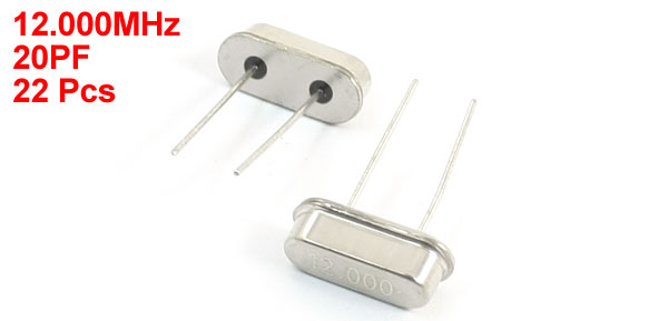 Product Name Crystal Oscillator Output Frequency 12.000MHz Package Type HC-49S Frequency Tolerance ±20ppm Load Capacitance 20PF Mounting Type DIP Effective Series Resistance 30ohm Pins Number 2 Color Silver Tone Each Size 16 x 10.5 x 4.3mm/ 0.63" x 0.41" x 0.17"(H*L*W) Weight 12g Package Content 22 x Crystal Oscillators - Reviews