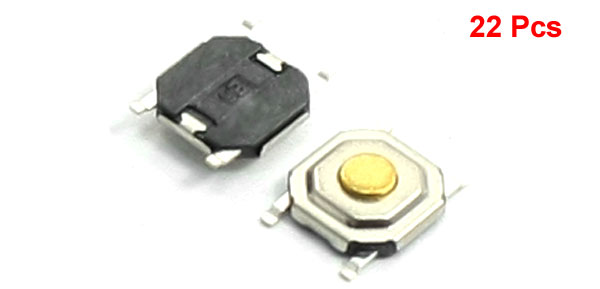 Details22pcs Momentary Tact Tactile Push Button Switch 4 Pin SMD Mount 4x4x1.5mm  Product Name Tact Switch Action Type Momentary Dimension 4 x 4 x 1.5mm / 0.16" x 0.16" x 0.05" (L*W*H) Button Size 0.5 x 2mm / 0.01" x 0.07"(H*D) Pin Size 1 x 0.5mm / 0.04" x 0.01" (L*W) Pin Spacing 3.1mm / 0.12" Material Plastic, Metal, Copper, Electric Parts Color Black, Silver Tone, Gold Tone Net Weight 4g Package Content 22 Pcs x Tact Switches