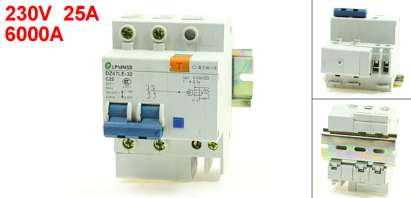 Product Name Circuit Breaker Model DZ47LE-32 C25 Rated Voltage 230V Rated Current 25A Rated Circuit Breaking Capacity 6000A Frequency 50Hz Mounting Type 35mm DIN Rail Mount Body Size (Approx.) 9.3 x 7.5 x 6.3cm/3.6" x 3" x 2.5"(L * W * H) Lead Rail Size 7.8 x 3.5 x 0.6cm/3.1" x 1.4" x 0.24"(L*W*H) Number of Poles 2 Material Plastic, Electric Components Color Gray, Blue Weight 274g Package Content 1 x Circuit Breaker