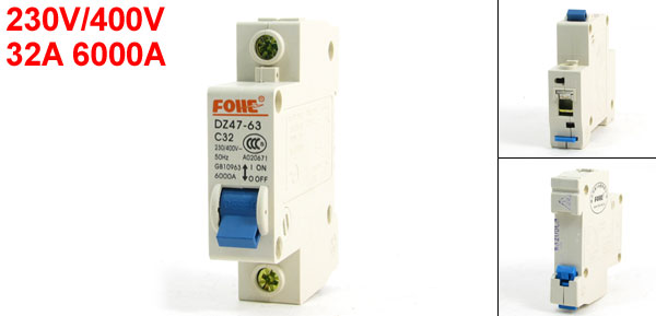 Product Name Circuit Breaker Model DZ47-63 C32 Rated Voltage 230V/400V Rated Current 32A Rated Circuit Breaking Capacity 6000A Frequency 50Hz Mounting Type 35mm DIN Rail Mount Total Size (Approx.) 8 x 7.5 x 1.8cm/3.15" x 3" x 0.7"(L * W * H) Number of Poles 1 Material Plastic, Electric Components Color White, Blue Weight 94g Package Content 1 x Circuit Breaker - Reviews