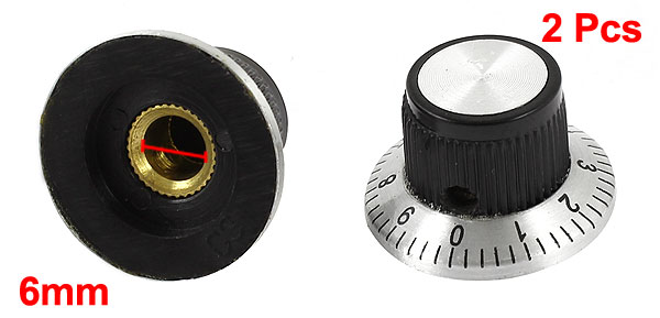 Details23mmx14mm 6mm Shaft Dia Potentiometer Control Volume Rotary Digital Knob 2 Pcs  Product Name Potentiometer Knob Cap Material Plastic, Metal Color Silver Tone, Black Shaft Hole Dia. 6mm / 0.24" Overall Size 23mm x 14mm / 0.9" x 0.55" (D*H) Weight 10g Package Included 2 x Potentiometer Knob